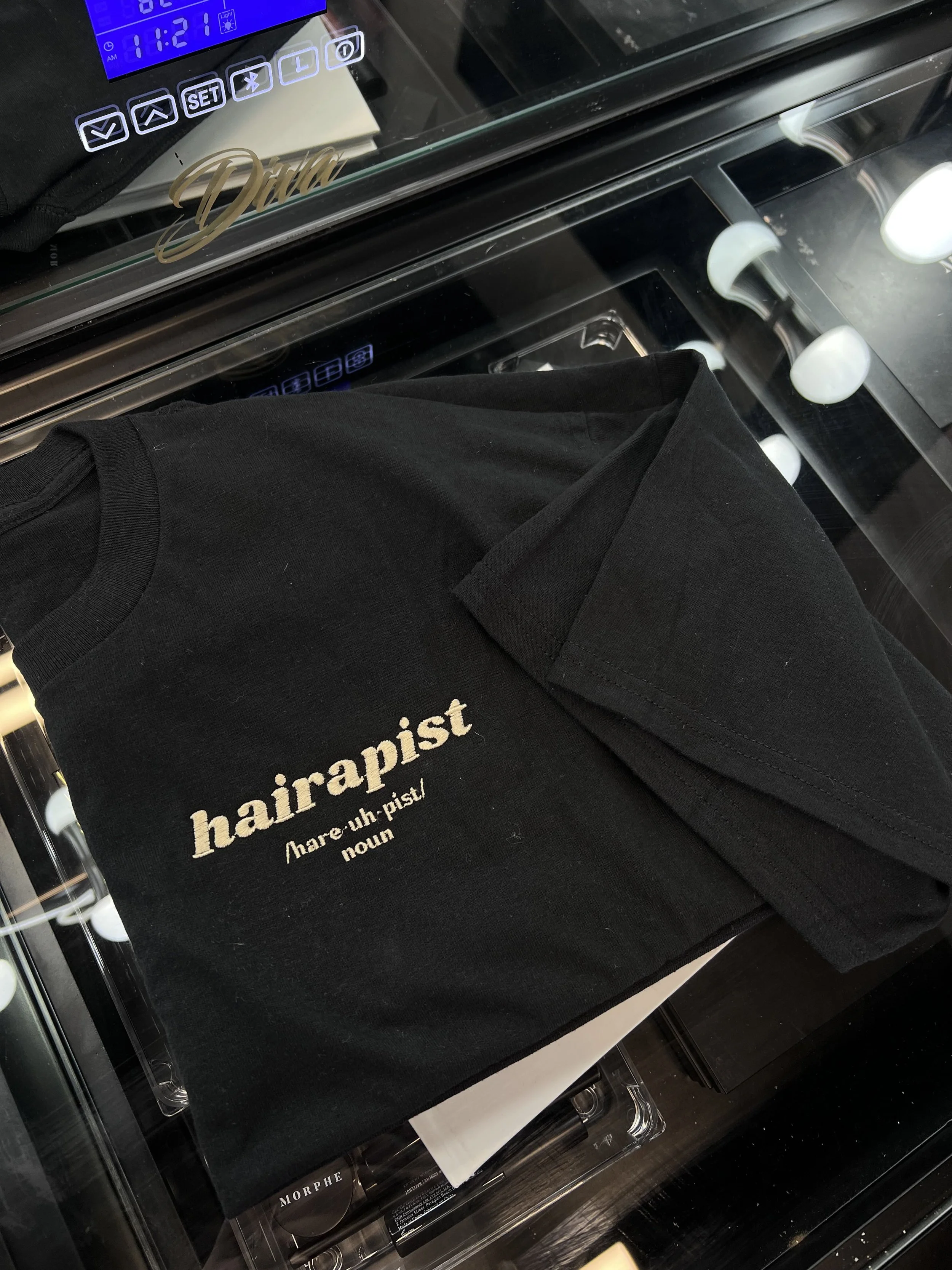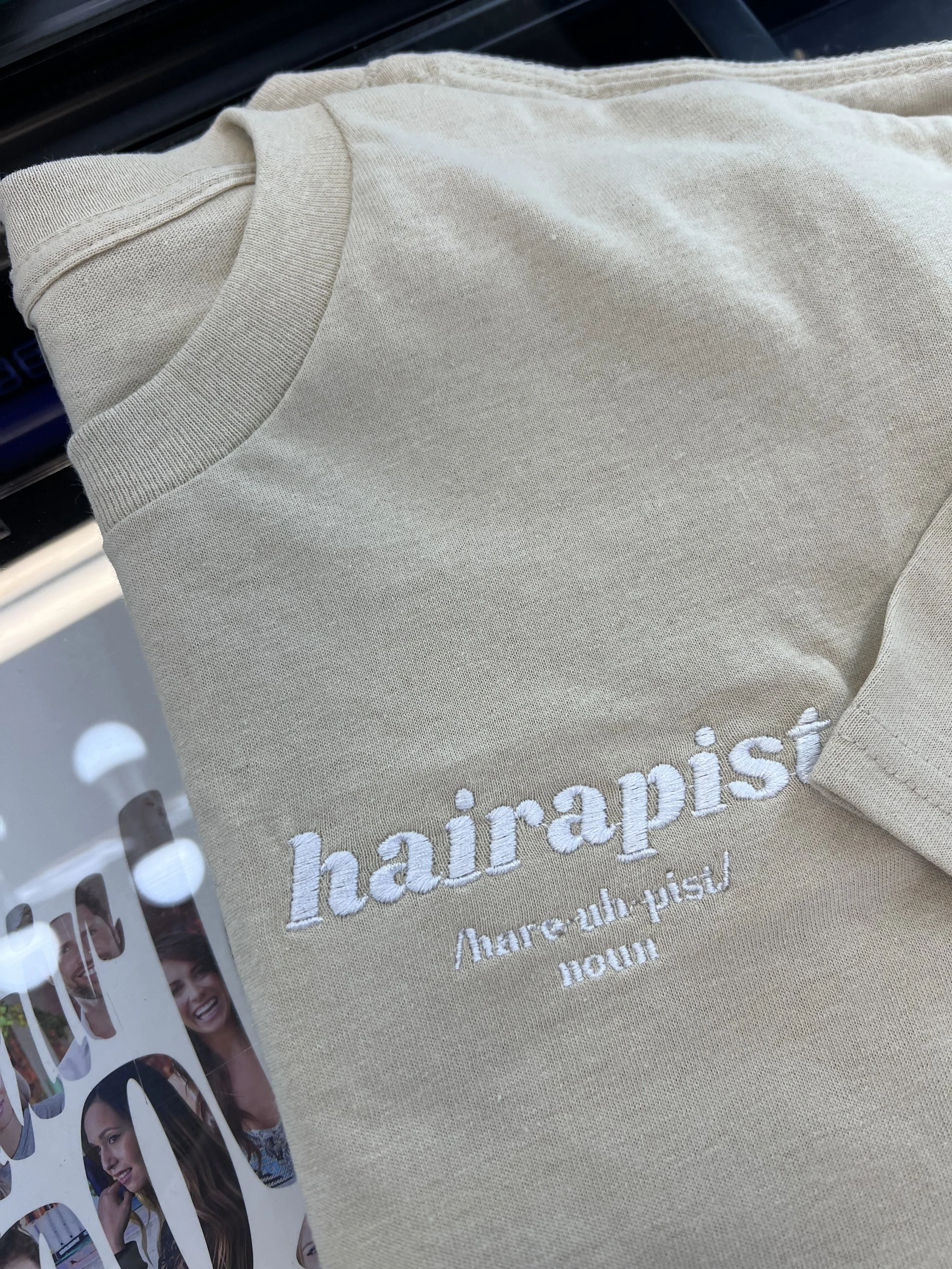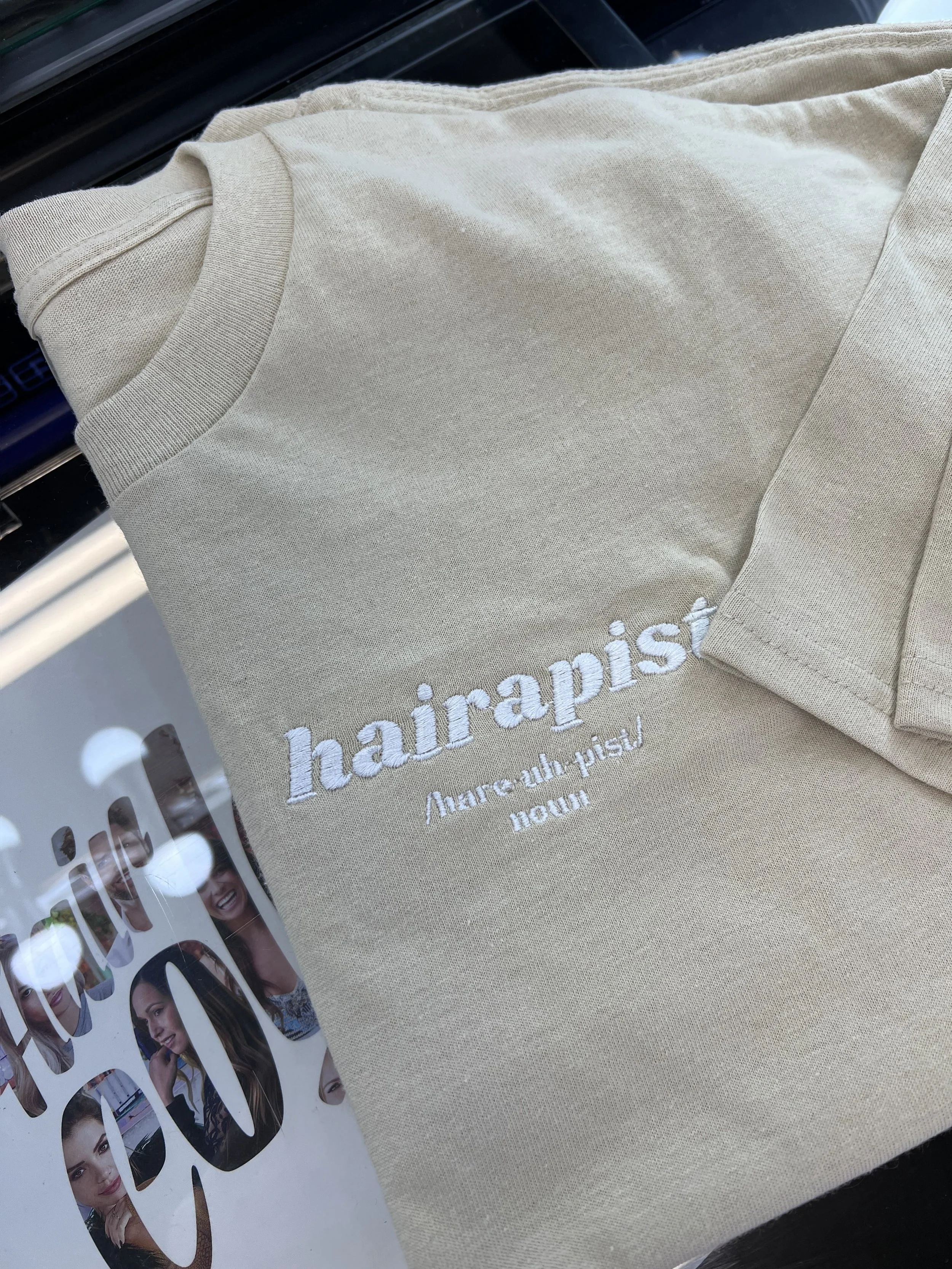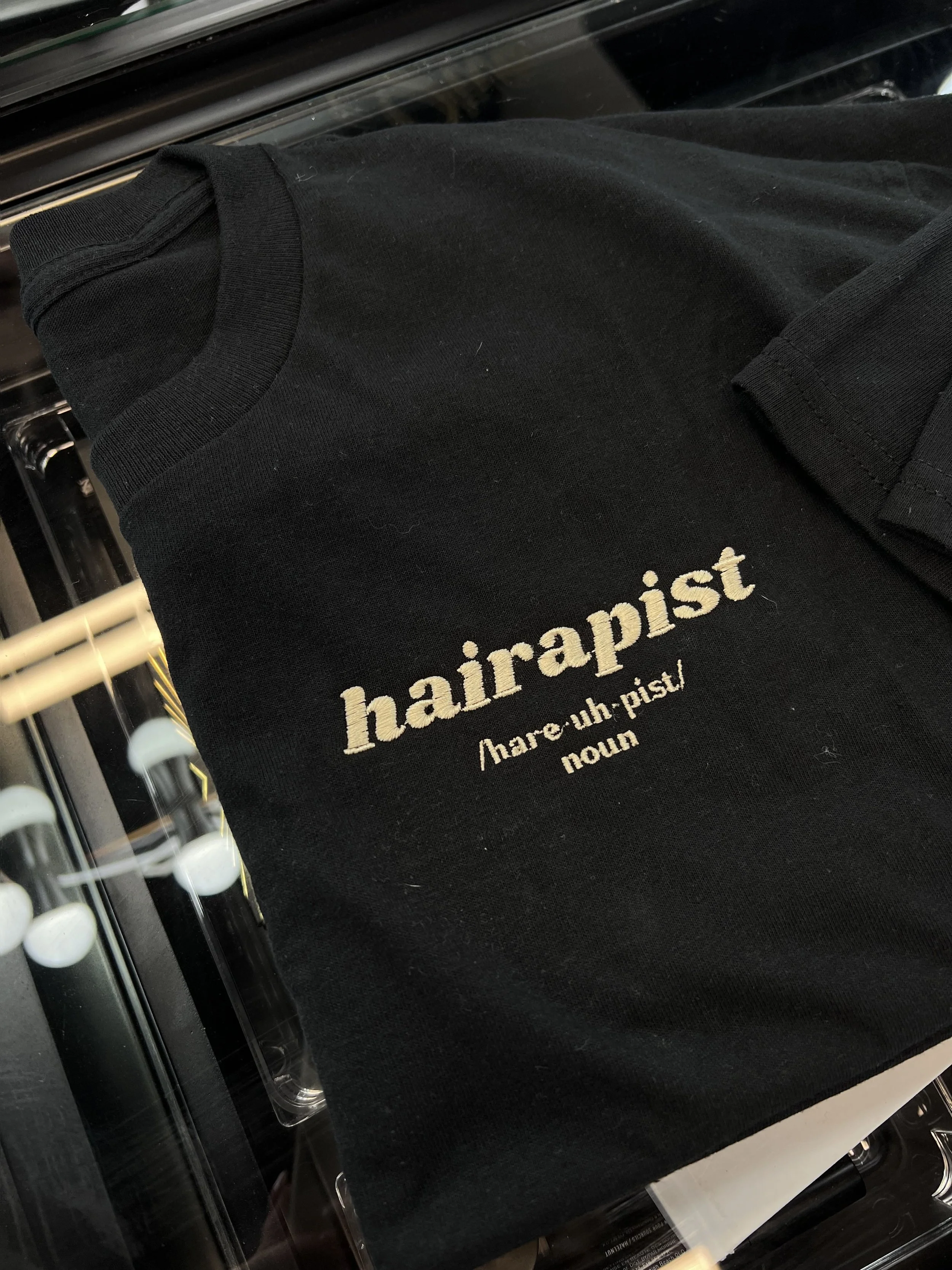 MERCH › HAIRAPIST T-SHIRT Image 1 of 5 Image 2 of 5 Image 3 of 5 Image 4 of 5 Image 5 of 5 HAIRAPIST T-SHIRT $30.00 - Breathable, durable material- Embroidered for long lasting wear - Fitted style, size up if you like it baggy Size: Select Size Small Medium Large X-Large Color: Select Color Tan with Black Embroidery Black with Tan Embroidery Add To Cart Added! - Breathable, durable material- Embroidered for long lasting wear - Fitted style, size up if you like it baggy